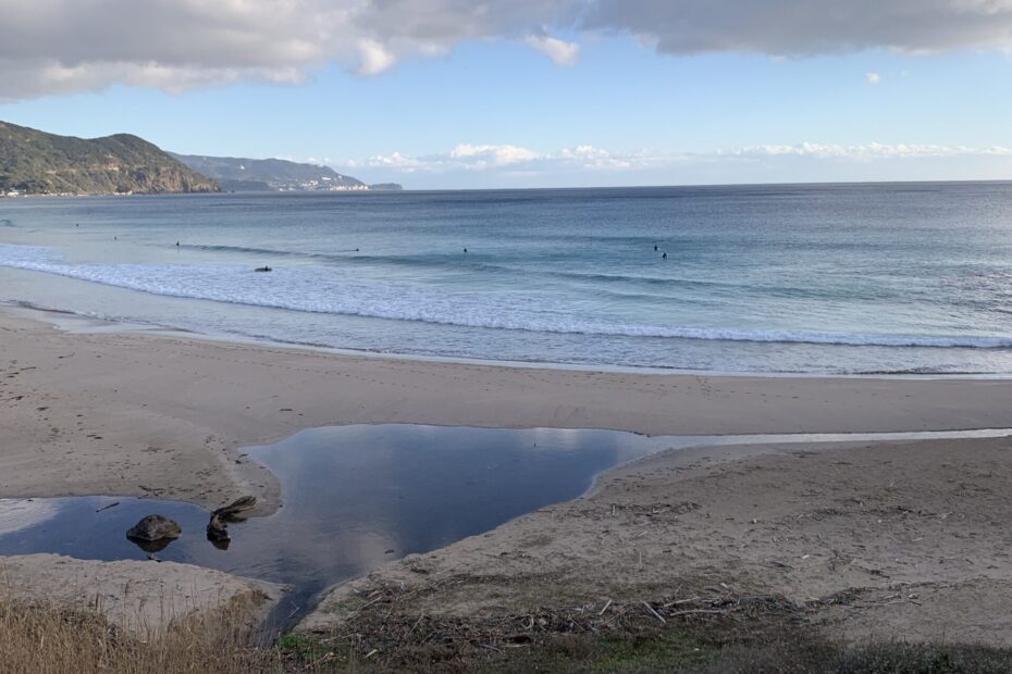 天気は晴れ、風はやや強い西風オフショア。海面は問題なく、波のサイズはヒザ~モモセット腰。ミドル~インサイドの厚いタラタラかトロ速いブレイク。サーファー9名。