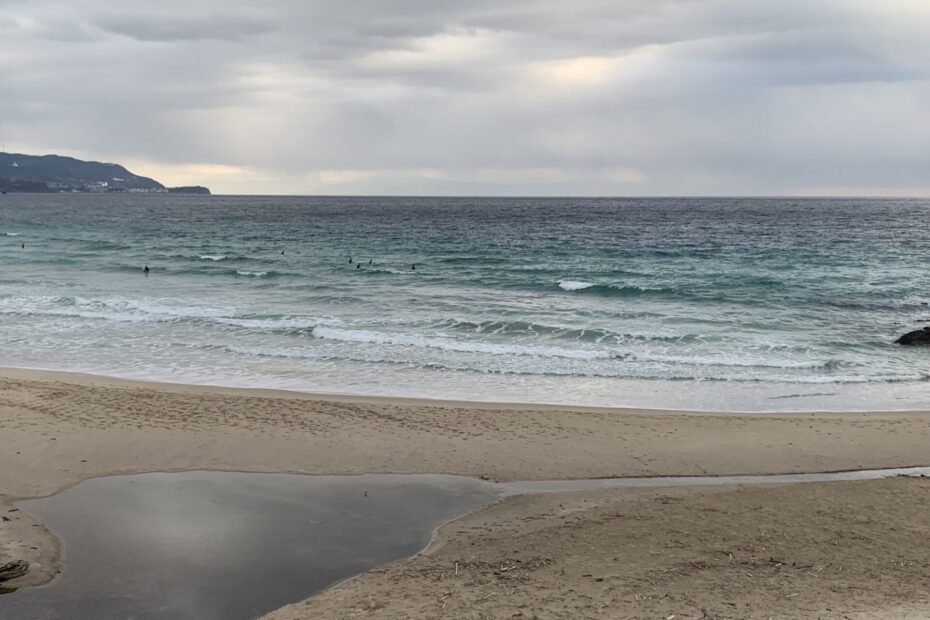 天気は晴れ、風はやや強い北東風サイドオン。海面は問題なく、波のサイズはモモ~腰前後。ミドル~インサイドのバラけて続かないかトロ速いブレイク。サーファー15名。