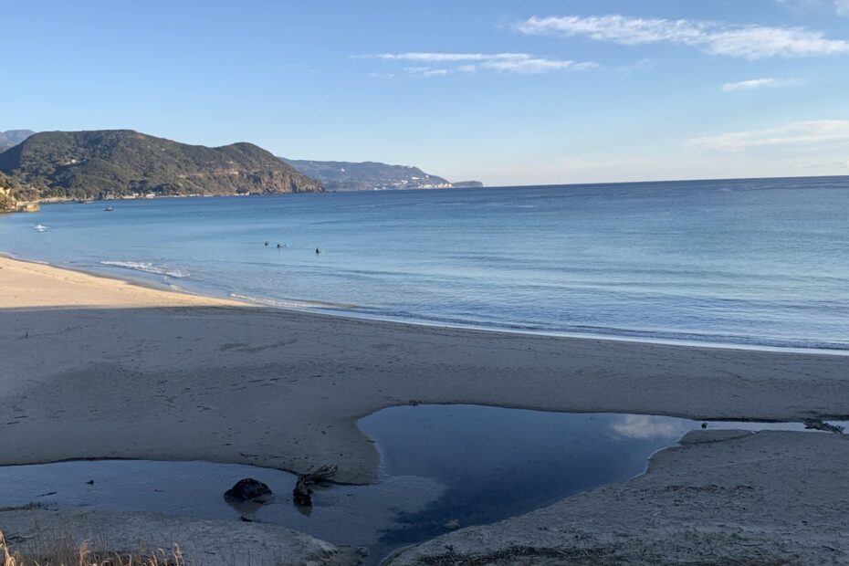 天気は晴れ、風は弱い西風オフショア。海面は問題なく、波のサイズはスネ~ヒザ。セット間隔はかなり長く、インサイドの力のないトロ厚いブレイク。波を選んでロングで少し滑れる程度。サーファー3名。